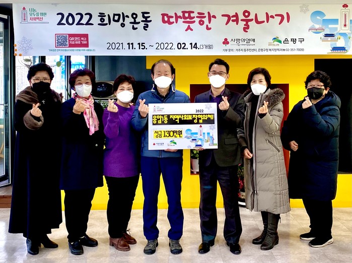 서울 은평구 응암1동은 지난 12일 동 지역사회보장협의체로부터 2022 따뜻한 겨울나기 성금 130만원을 전달받았다. 성금은 사회복지공동모금회를 통해 저소득층 가구 등 지역내 어려운 이웃들을 위해 사용될 예정이다. 사진은 전달식에서 관계자들이 기념촬영을 하는 모습. (사진제공=은평구청)