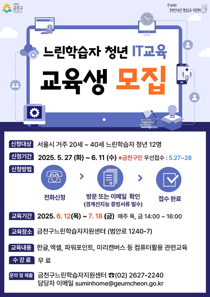 [시민일보 = 여영준 기자] 금천구(구청장 유성훈)는 27일부터 ‘느린학습자 청년 IT교육’ 참여자를 모집한다고 밝혔다.