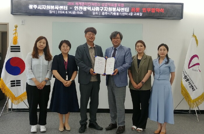 | 인천 중구자원봉사센터와 광주시 자원봉사센터간 업무협약 체결행사 참가자들이 포즈를 취하고 있다. |