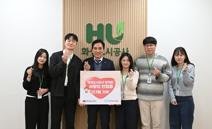 | ▲화성도시공사는 연말을 맞아 임직원들의 자발적 참여로 모인 헌혈증 137매를 한국백혈병소아암협회에 기부하며, 생명 나눔을 통한 사회적 가치 실현에 나섰다 /사진제공=화성도시공사 |