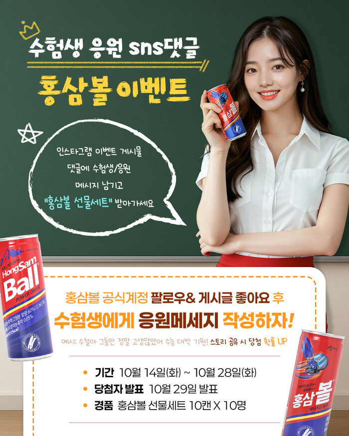 이번 이벤트를 통해 추첨된 10명에게는 ‘홍삼볼 선물세트(10캔)’ 가 증정된다. 당첨자는 10월 29일(수) 홍삼볼 공식 인스타그램 계정을 통해 발표될 예정이다.