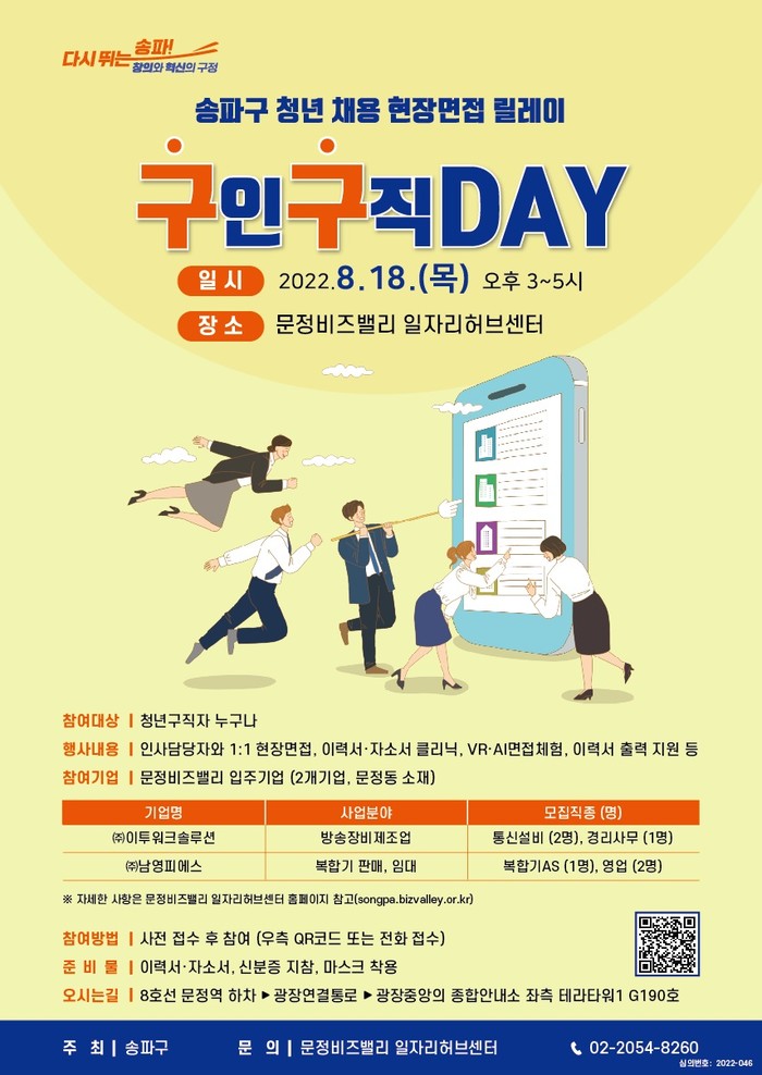 한편, 문정비즈밸리 일자리허브센터는 평일 오전 9시~오후 6시 운영되며 취업 상담 및 구인 관련 문의는 전화, 혹은 방문(송파대로 167, 테라타워1 지하 1층 190호)으로 자세히 안내받을 수 있다.