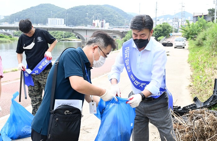 (사)대한민국재난구조협회 경기남부광주지회는 지난 7일 경기 광주시 곤지암천 일원에서 팔당수계 수중정화활동을 펼쳤다. 이날 정화활동에서는 폭우에 떠내려온 하천변 쓰레기 및 수중 부유물질 등 총 3톤의 쓰레기를 수거했다. 사진은 방세환 시장(오른쪽)이 하천정화활동에 함께 참여하고 있는 모습. (사진제공=광주시청)