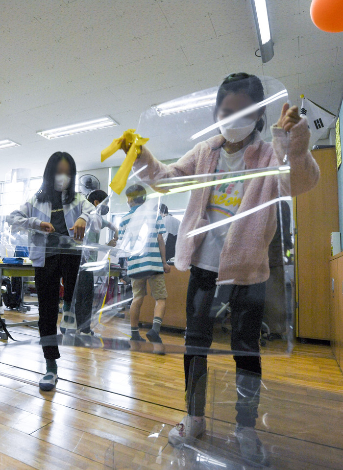 전국 모든 학교에서 정상 등교가 이뤄진 2일 서울 광진구 광장초등학교 학생들이 자리에 설치돼 있던 가림판을 제거하고 있다.