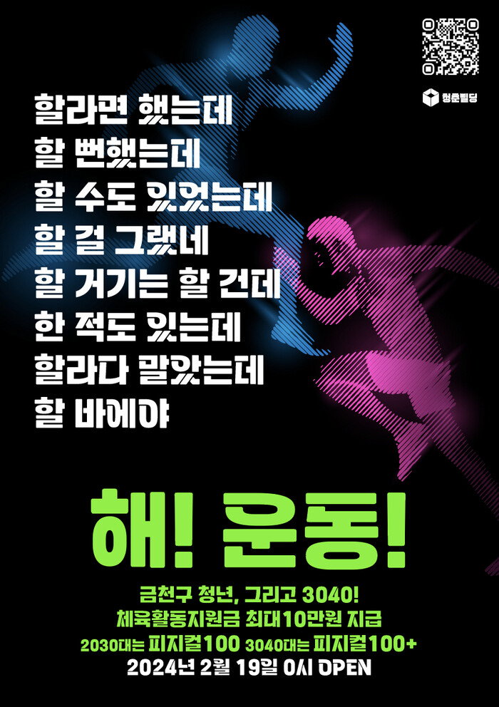 ‘피지컬100’과 ‘피지컬 100+’ 신청자 모집은 오는 19일 오전 0시부터 선착순으로 진행된다. 자세한 사항은 각각 ‘청춘삘딩’ 누리집과 금천구청 블로그에서 확인할 수 있다.