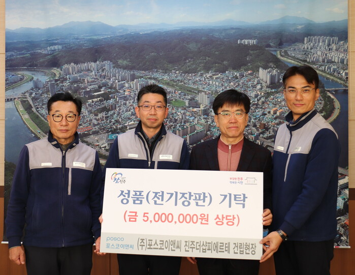 ㈜포스코이앤씨 더샵진주피에르테 건설현장(현장소장 이준혁)은 22일 진주시복지재단(이사장 이성갑)을 방문해 취약계층 지원을 위한 전기매트 51개(환가액 510여만 원 상당)를 기탁했다.
