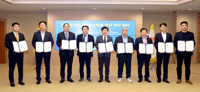 광주광역시(시장 강기정)는 24일 시청 비즈니스룸에서 신한은행 땡겨요, ㈜위메프오, (재)광주경제진흥상생일자리재단, 광주은행, 광주광역시소상공인연합회, ㈔한국외식업중앙회 광주지회, 광주광역시상인연합회, 한국프랜차이즈산업협회 광주전남지회와 ‘광주공공배달앱 활성화 업무협약’을 체결했다.
