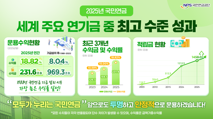 2025년 국민연금기금 수익률은 18.82%(금액가중 수익률), 수익금은 231.6조 원*을 기록하면서 연말 기금 적립금이 1,458조 원, 기금 설치 이래 누적수익률은 연평균 8.04%를 기록한 것으로 잠정 집계되었다.