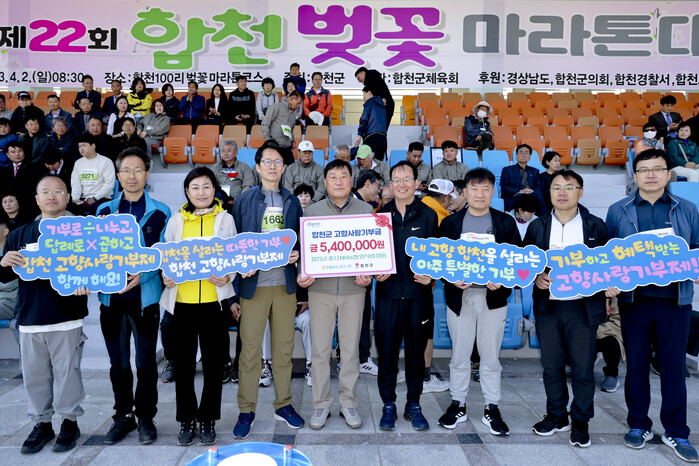 이날 합천 출신 NH농협 임원 9명도 고향사랑기부금 540만원을 기탁했다. NH농협 임원 9명은 농협네트웍스 부산울산지사 김선옥 지사장과 창녕교육원 이광수 원장, 신용보증기금관리국 류길년 국장, 경남본부 강문규 부본부장, NH농협생명 장병철 총국장, 농협금융지주 이사회사무국 박종국 국장, 농협중앙회 합천군지부 노순현 지부장, 농협중앙회 합천군지부 전용호 단장, 농협중앙회 경남검사국 노준용 반장이다. 이들은 각각 합천읍, 봉산면, 초계면, 쌍책면, 적중면, 대양면, 삼가면, 용주면 출신 출향인으로 이날 임원 9명 중 8명이 합천벚꽃마라톤대회에 참석하면서 고향사랑기부도 참여해 애향심을 보였다.