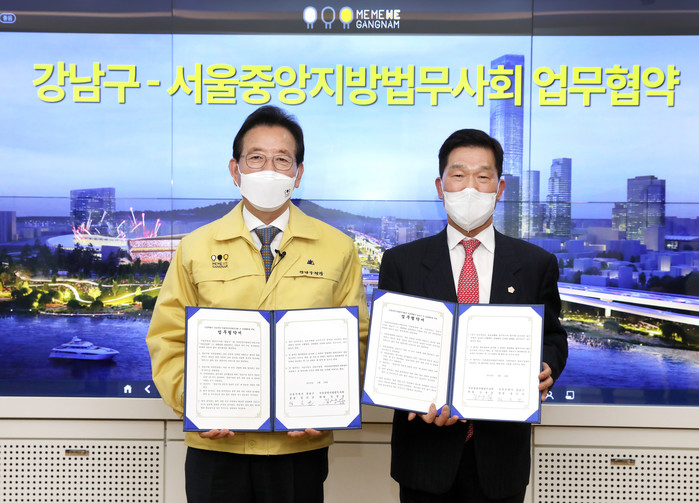 강남구가 최근 서울중앙지방법무사회와 구청에서 강남구 법률복지 증진을 위한 업무협약을 체결하고, ‘전문가상담실’의 법무사 상담서비스를 확대·활성화하는 데 힘을 모으기로 했다. 사진은 정순균 구청장(왼쪽)이 협약을 체결하고 기념촬영을 하고 있는 모습. (사진제공=강남구청)