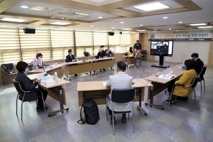 이어 이성호 풍물굿패 삶터 터장, 이득현 수원시 2030지속가능발전 9번 목표 위원장, 정명희 한국문인협회 수원지부장, 박정봉 한국국악협회 수원시지부장, 김대준 수원미술협회 분과위원장, 이상희 수원시 문화예술과장, 최지연 수원시정연구원 연구위원이 토론자로 참여해 수원시 문화예술 정책에 대한 다양한 의견을 내놓고 열띤 토론을 펼쳤다.