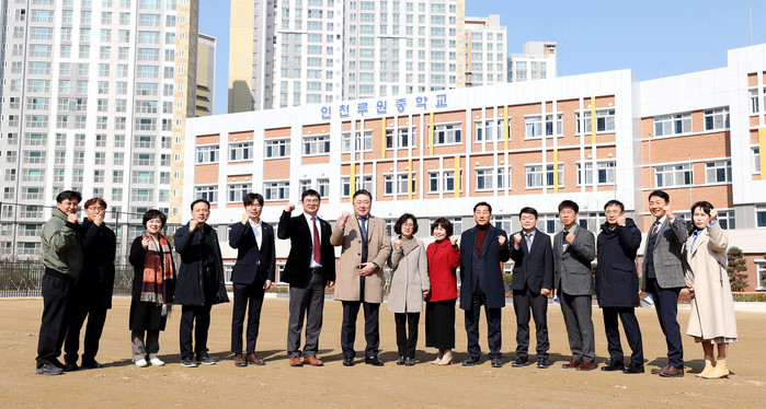 | ▲ 인천루원중학교를 찾은 인천시의회 교육위원회 의원들이 기념촬영을 하고 있다. (사진=인천시의회 제공) |