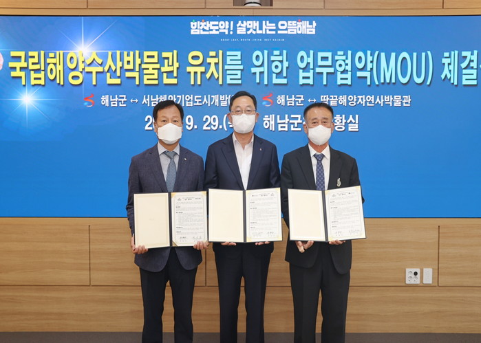 군은 29일 서남해안기업도시개발(주), 땅끝해양자연사박물관과 잇따라 업무협약을 체결하고 해양수산박물관 유치에 적극 협력해 나가기로 했다.