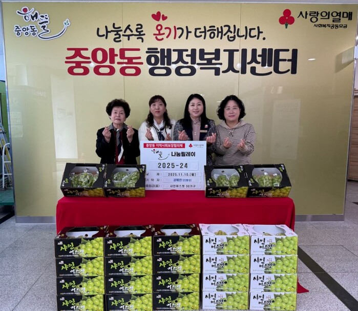 경기 오산시 중앙동 행정복지센터가 10일 (주)인슈프라자 오산지점 공혜란 지점장으로부터 지역내 취약계층 지원을 위한 샤인머스캣 2kg 30박스(약 150만원 상당)를 기탁받았다. 사진은 기탁식에서 관계자들이 기념 촬영을 하는 모습. (사진=오산시청 제공)