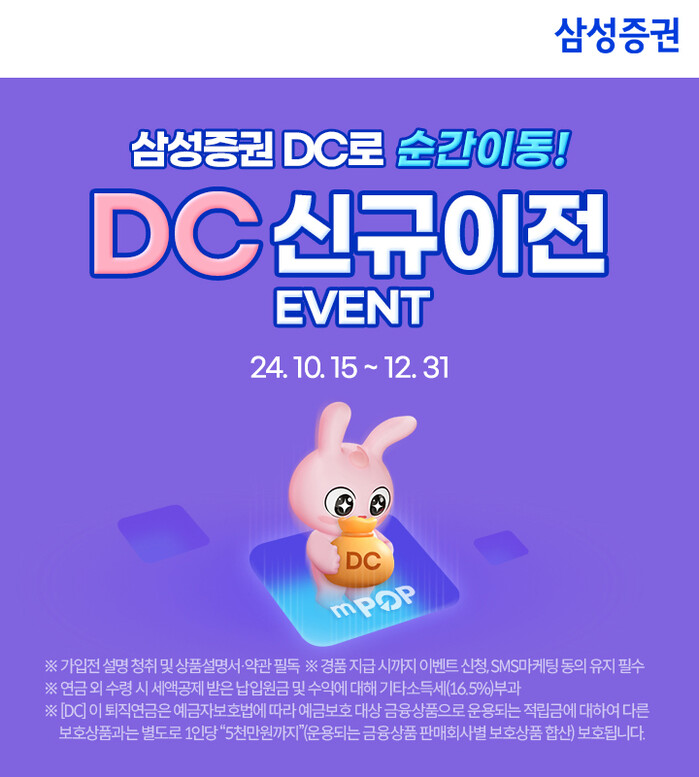 [시민일보 = 여영준 기자] 삼성증권은 삼성증권 확정기여형(DC) 퇴직연금계좌에 일정금액 이상 입금한 고객을 대상으로 상품권을 제공하는 'DC신규이전' 이벤트를 오는 12월31일까지 진행한다고 30일 밝혔다.