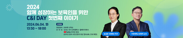 [시민일보 = 여영준 기자] 삼성복지재단이 전국 어린이집 원장을 대상으로 '2024 함께 성장하는 보육인을 위한 C&I(Culture & Insight) DAY - 첫번째 이야기' 특강을 6월4일 오후 1시30분부터 6시까지 삼성아동교육문화센터와 삼성e-보수교육캠퍼스 홈페이지에서 온·오프라인 동시 개최한다.