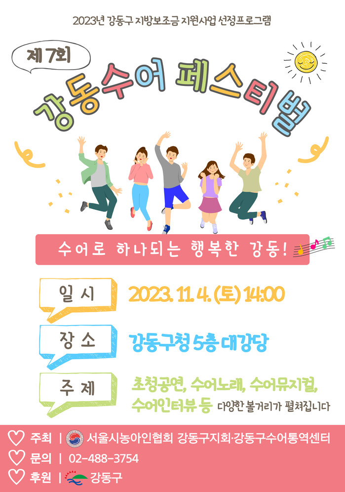 [시민일보 = 이대우 기자] 서울 강동구(구청장 이수희)가 오는 4일 구청 대강당에서 ‘제7회 수어 페스티벌’을 개최한다.