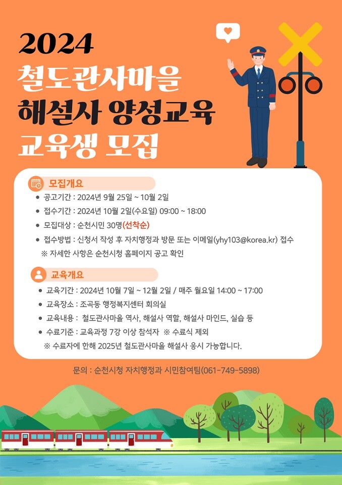 교육대상은 순천시민 30명으로 공고일 전일 기준 시에 주민등록을 둔 시민이라면 누구나 신청이 가능하다.