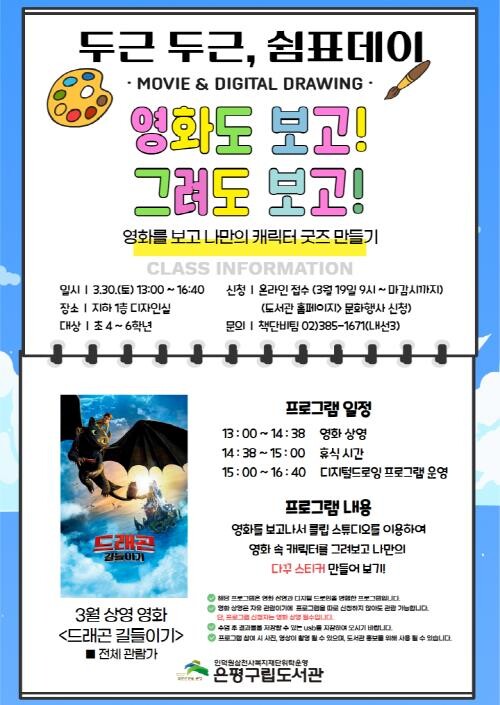 [시민일보 = 이대우 기자] 서울 은평구(구청장 김미경)는 오는 30일부터 홀수달 마지막 주 토요일 영화 상영과 디지털드로잉 프로그램을 연계한 ‘영화도 보고! 그려도 보고!’를 운영한다고 밝혔다.