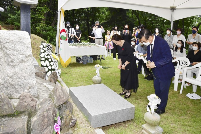 지난 23일 오후 사단법인 색동회에서 주관하는 소파 방정환 선생 91주기 추모식이 중랑구 망우역사문화공원 내 방정환 묘역에서 열렸다. 이날 추모식에는 류경기 구청장과 색동회 이사장을 비롯한 색동회 회원, 방씨종친회대표, 어린이연대이사장 등 50여명이 참석했다. 사진은 류 구청장(오른쪽)이 헌화를 하고 있는 모습. (사진제공=중랑구청)