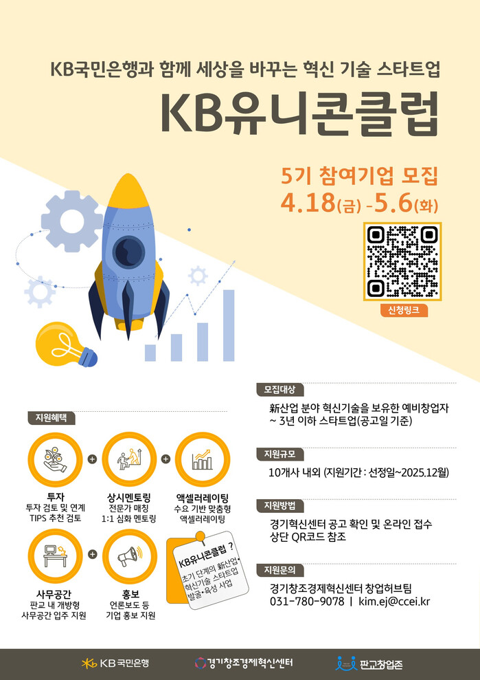 [시민일보 = 박소진 기자] KB국민은행이 신생기업의 안정적인 성장을 지원하는 'KB유니콘클럽' 5기에 참여할 기업을 모집한다.