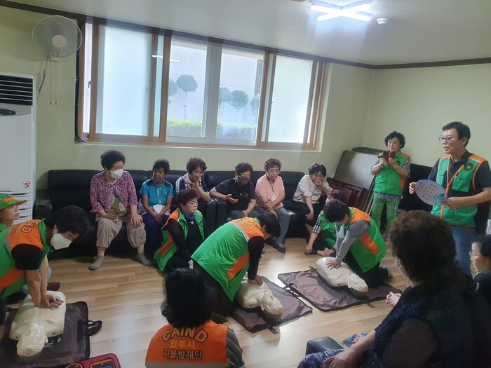 이날 교육은 어르신 및 방재단원 30여 명이 참여한 가운데 심정지 환자 발생 시 대처 요령, 올바른 심폐소생술 자세 등 위급한 상황에서 적절한 대처가 이루어질 수 있도록 실제 위급상황을 시뮬레이션하면서 교육이 진행됐다.