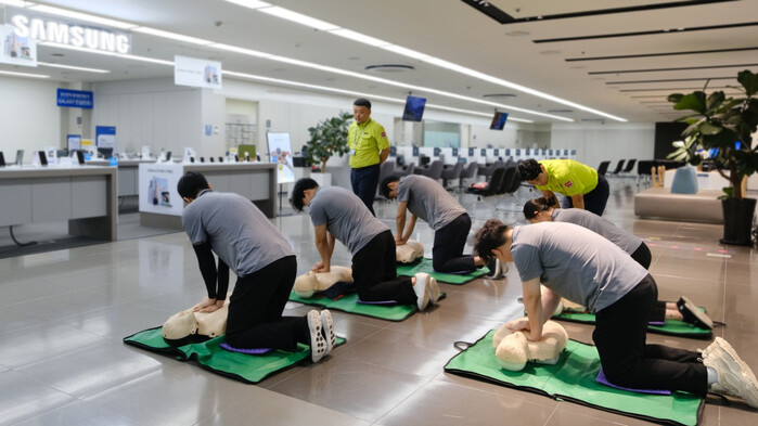 삼성전자서비스는 갑작스러운 심정지 상황에서 고객과 임직원을 보호하기 위해 지난 2019년부터 매년 응급처치 실습 교육을 진행하고 있다.