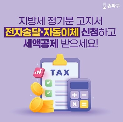 [시민일보 = 이대우 기자] 서울 송파구가 오는 6월 자동차세 1기분부터 지방세 전자송달 및 자동이체를 신청한 납세자에게 세액공제 혜택을 확대한다고 26일 밝혔다.