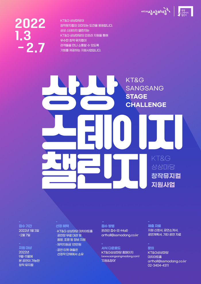 [시민일보 = 홍덕표 기자] KT&G가 국내 창작 뮤지컬 지원 프로그램인 ‘제5회 상상 스테이지 챌린지’ 참여 작품을 이달 3일부터 2월7일까지 공개 모집한다.