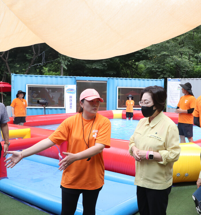 | ▲ 박희영 구청장이 26일 응봉공원에서 실시된 어린이 여름 물놀이장 사전 점검 중 안전관리요원의 설명을 듣고 있다. (사진=용산구청 제공) |