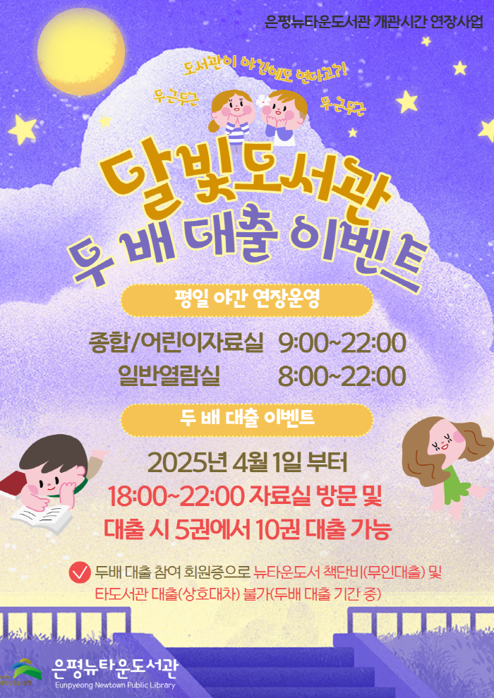 구립은평뉴타운도서관(관장 박종범)에서는 2025년 개관시간 연장사업을 홍보하고, 평일 야간 시간대 도서관 운영 활성화를 위해 ‘달빛도서관 두 배 대출 이벤트’를 진행한다.