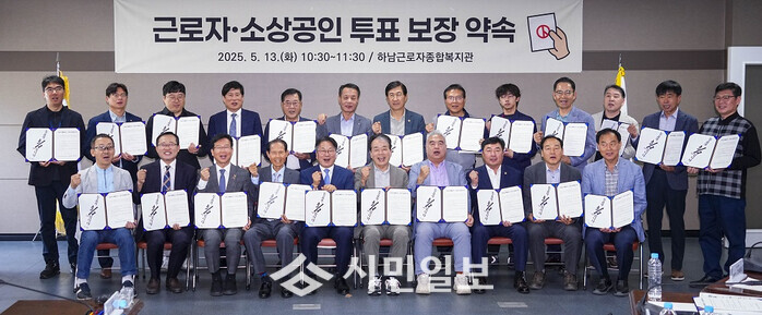 광주광역시(시장 강기정)는 13일 오전 하남근로자종합복지관 회의실에서 ‘제21대 대통령선거 근로자·소상공인 투표참여 약속’을 개최했다. 이번 행사는 근로자들이 사전투표(5월 29~30일)나 본투표(6월 3일)에 불이익 없이 투표할 수 있는 환경을 함께 조성하자는 데 뜻이 모아져 마련됐다.