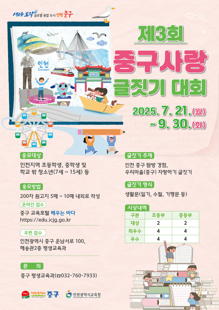 접수 기간은 오는 9월 30일까지다. 참가 희망자는 해당 기간 내에 신청서와 글짓기 작품을 우편(중구 운남서로 100, 해송관2층 평생교육과) 제출하거나, 인천 중구 교육포털 ‘배우는 바다’로 제출하면 된다.