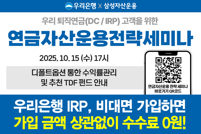 세미나 참여는 우리WON뱅킹 앱 ‘메뉴(三) ▷새소식 ▷퇴직연금(IRP/DC) ‘연금자산·운용전략’비대면 라이브 세미나 안내’공지를 클릭하거나 은행 홈페이지 홍보센터에 게시된 QR코드를 통해 접속할 수 있다.