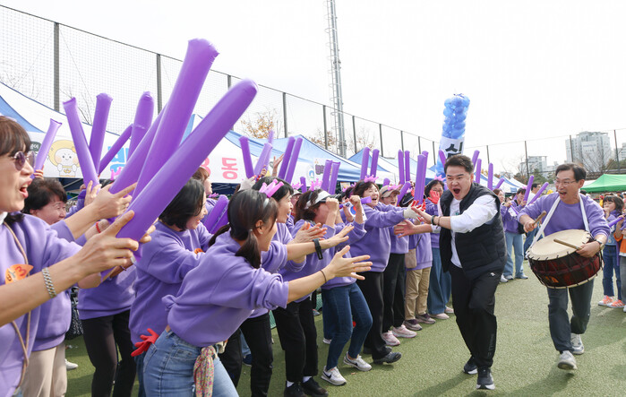 서울 도봉구는 최근 다락원체육공원에서 지역주민 2200여명이 참여하는 ‘2023 도봉구민 체육대회’를 개최했다. 사진은 오언석 구청장(오른쪽 두 번째)이 주민과 함께 응원을 펼치고 있는 모습. (사진=도봉구청 제공)