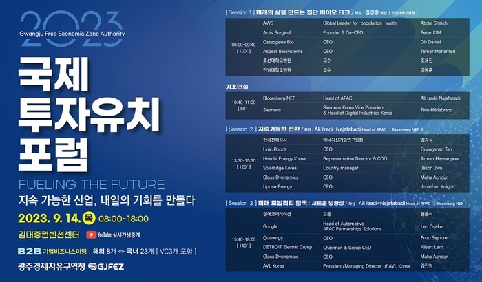 광주경제자유구역청은 글로벌 산업트렌드의 새로운 방향성을 전망하고 관련 기업들의 비즈니스협력 기회의 장인 ‘2023 국제투자유치포럼’을 14일 김대중컨벤션센터에서 개최한다.