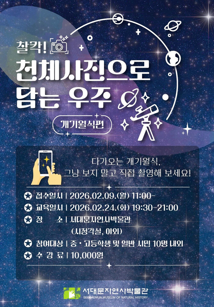 [시민일보 = 이대우 기자] 서울 서대문구(구청장 이성헌)가 서대문자연사박물관에서 체험형 강좌인 ‘찰칵! 천체사진으로 담는 우주-개기월식 편’을 마련했다고 3일 밝혔다.
