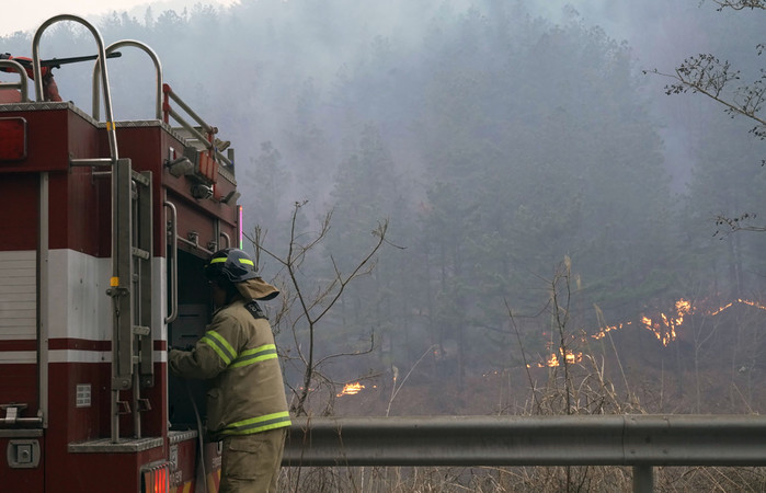 17일 오전 경북 영덕군 영덕읍 일대에 산불 대응 및 민가 보호를 위해 배치된 소방차량에서 한 대원이 작업을 준비하고 있다. 지난 15일 발생한 이 불은 일차적으로 불길이 잡혔다가 전날 다시 번지기 시작했다. (사진제공=연합뉴스)