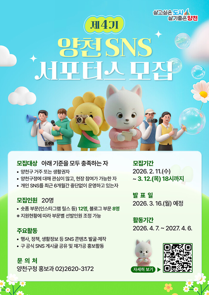 [시민일보 = 박소진 기자] 양천구(구청장 이기재)가 구정 소식을 주민의 시선으로 생동감 있게 전달할 ‘제4기 양천 SNS 서포터스’를 3월12일까지 모집한다. 선발인원은 총 20명으로, 숏폼 부문(인스타그램 릴스 등) 12명과 블로그 부문 8명이다.