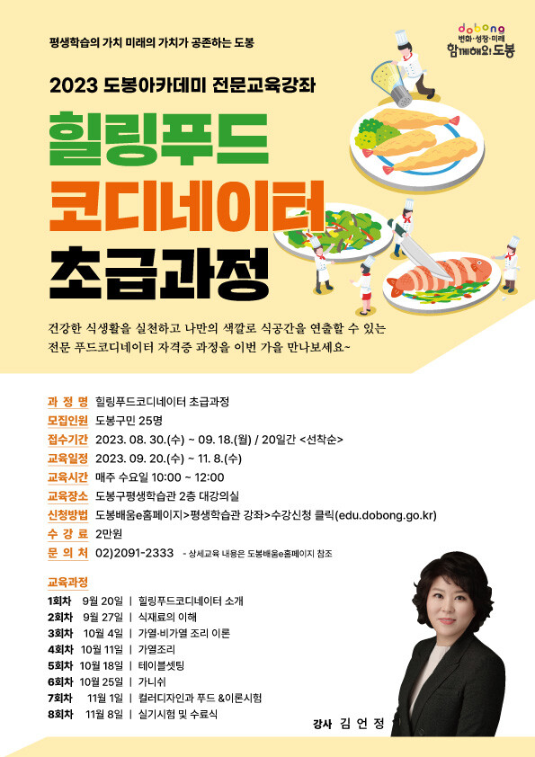 구민 누구나 오는 30일~9월18일 도봉배움e홈페이지를 통해 신청 가능하며 수강료는 2만원이다. 교육을 수료한 수강생에게는 힐링푸드코디네이터 초급 자격증이 발급된다.