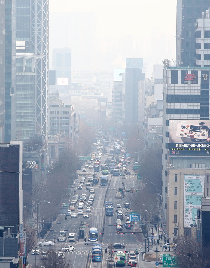 미세먼지 농도 '나쁨'을 보인 28일 오전 서울 종로 인근이 뿌옇게 보인다.