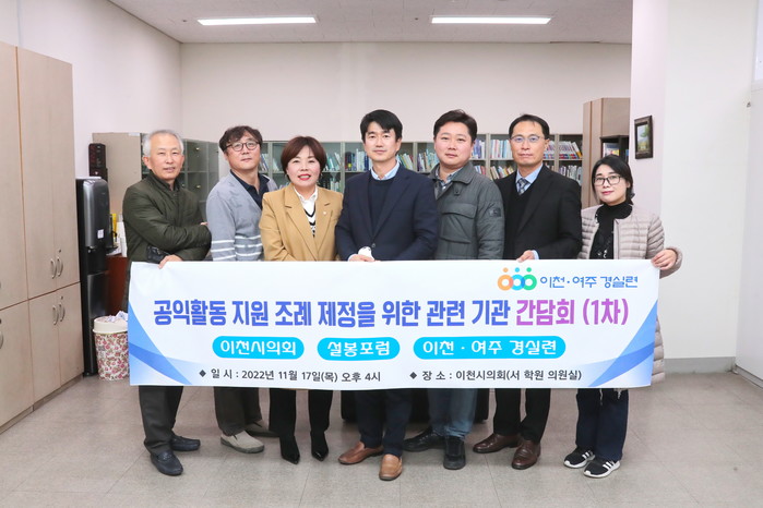 [시민일보 = 민장홍 기자] 경기 이천시의회 박노희, 박준하, 서학원 의원과 시민단체인 설봉포럼, 이천·여주경실련이 최근 이천시의회에서 공익활동 활성화 지원 조례 입안을 위한 기초자료 수집과 공론화를 위해 다양한 의견을 교환했다.