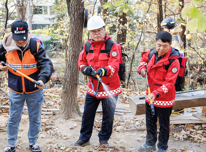 진교훈 서울 강서구청장이 최근 ‘유관기관 합동 산불진압훈련’을 열고 산불 대응 체계를 직접 살폈다. 산불과 같은 재난은 주민의 안전과 직결되는 만큼 구청장이 현장에서 직접 챙긴다는 취지다. 사진은 진 구청장(가운데)이 우장산 일대에서 열린 훈련에서 등짐펌프를 메고 잔불진화작업을 하는 모습. (사진=강서구청 제공)