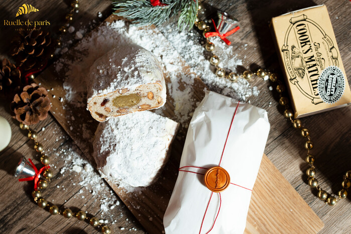 루엘드파리의 슈톨렌은 이태리산 피스타치오 페이스트와 아몬드 가루로 만든 수제 마지팬으로 슈톨렌의 풍미를 극대화한 것이 특징이다. 무화과를 비롯해 크렌베리, 레몬필, 오렌지필 등을 다크 럼에 절여 풍부한 과일향을 더 했으며, 신선한 호두, 피칸, 피스타치오, 아몬드는 오븐에 구워 떫은 맛없이 고소한 풍미와 식감이 일품으로 다가오는 크리스마스 파티에 어울리는 베이커리 제품이다.