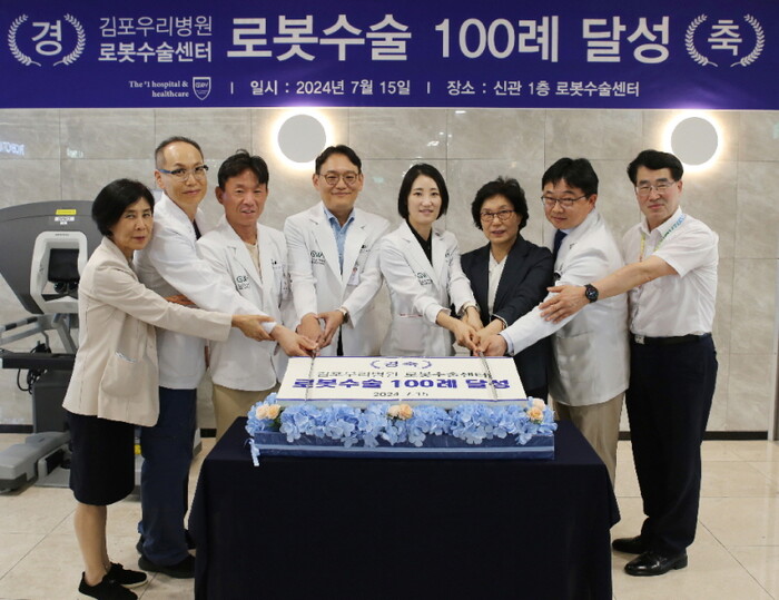 | 김포우리병원 ‘다빈치 Xi’ 로봇수술 100례를 달성, 기념행사 참가자들이 포즈를 취하고 있다. |