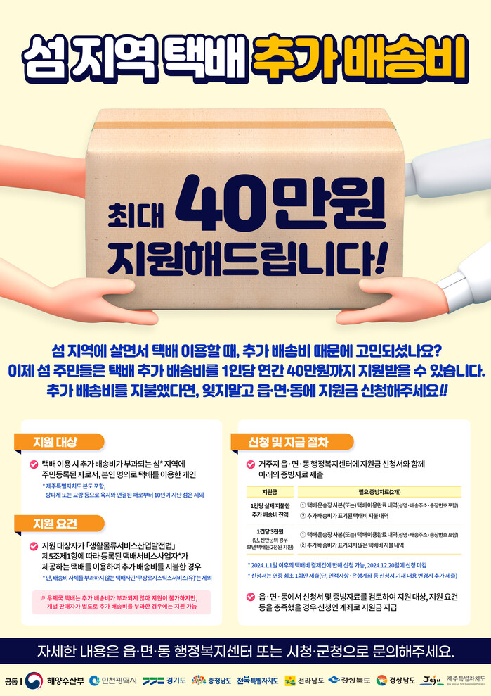 섬 주민이 본인 명의로 택배를 이용(수ㆍ발신)하고 거주지 읍ㆍ면ㆍ동사무소에 신청서와 증빙자료를 제출하면 간단한 확인 절차를 거쳐 본인 계좌로 직접 지원받을 수 있다.