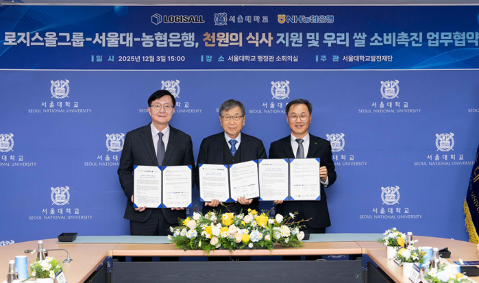 | ▲ NH농협은행은 지난 3일 관악구 서울대학교에서 로지스올그룹과 서울대학교 '천원의 아침식사' 지원 업무협약을 체결했다. (오른쪽부터) NH농협은행 엄을용 부행장, 로지스올그룹 서병륜 회장, 서울대학교 유홍림 총장. (사진=NH농협은행 제공) |