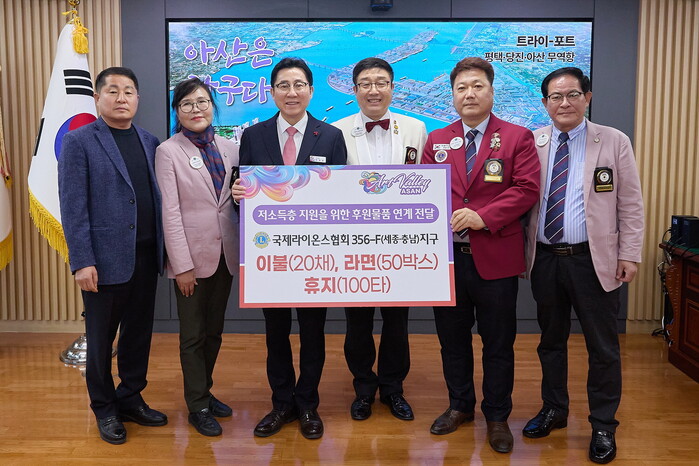 [아산=박명수 기자] 국제라이온스협회 356-F지구(세종·충남) 아산지역위원회가 최근 충남 아산시를 찾아 취약계층을 위한 후원물품으로 이불 20채, 라면 51박스, 휴지 30롤 100팩, 물티슈 5박스(500만원 상당)를 전달했다.