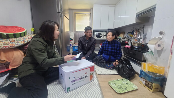 [예산=김의석 기자] 충남 예산군 응봉면 행정복지센터는 13일 겨울철을 맞아 거동 불편 노인 가정을 방문해 사랑의 편지 및 밑반찬(김장김치 및 수육)을 전달했다.