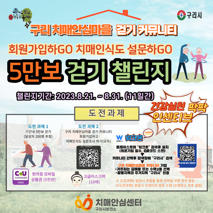 구리시 치매안심센터에서 오는 21일부터 12월31일까지 5개월간 5회에 걸쳐 매달 다양한 걷기 챌린지를 진행하고, 치매인식개선 사전·사후 설문조사를 통해 치매인식개선 캠페인도 병행할 예정이다.